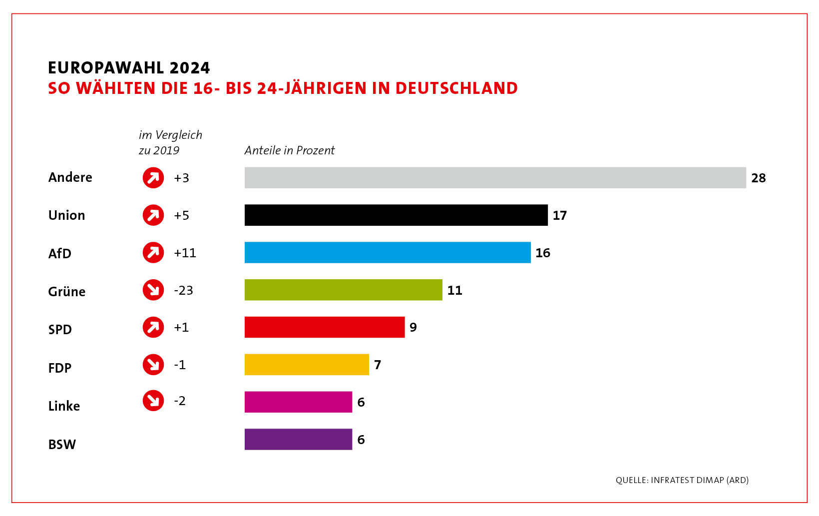 Bei Halbzeitwahlen wie jetzt der Europawahl sind die Oppositionsparteien häufig im Vorteil, weil sie nicht mit schwierigen Entscheidungen der vergangenen Monate verbunden werden. Aber: Die CDU lag bei den jungen Wähler*innen deutlich unter ihrem Gesamtergebnis. Die AfD hat bei den Erstwähler*innen deutlich schlechter abgeschnitten, als vor der Wahl befürchtet. Das Ergebnis zeigt, dass junge Menschen, was die AfD angeht, nicht anders ticken als die Gesellschaft insgesamt. Die Mär von der rechten Jugend lässt sich nicht halten.
